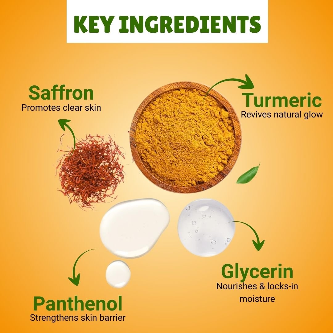 - Turmeric: Enhances the skin’s natural glow while improving overall appearance.